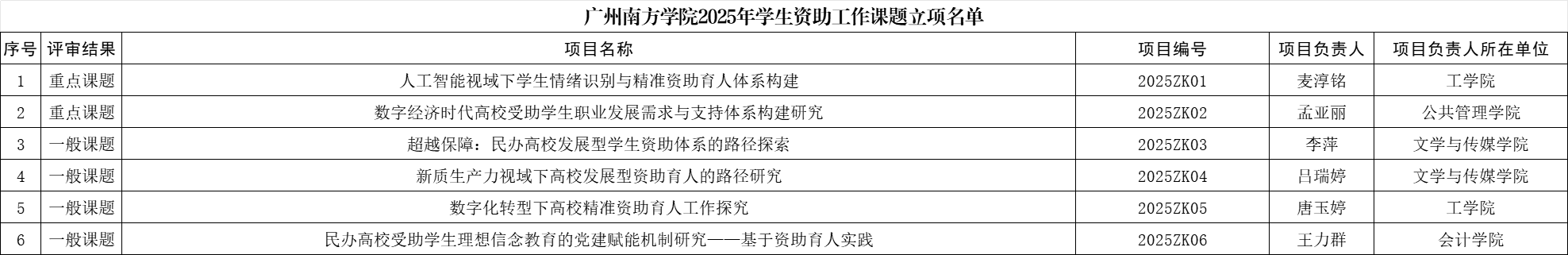 根据《学生处关于做好2024年学生资助工作课题结题及2025年学生资助工作课题申报工作的通知》要求,经学生处组织专家小组进行2025年学生资助工作课题立项评审(均为盲审方式),现将结果公布如下: