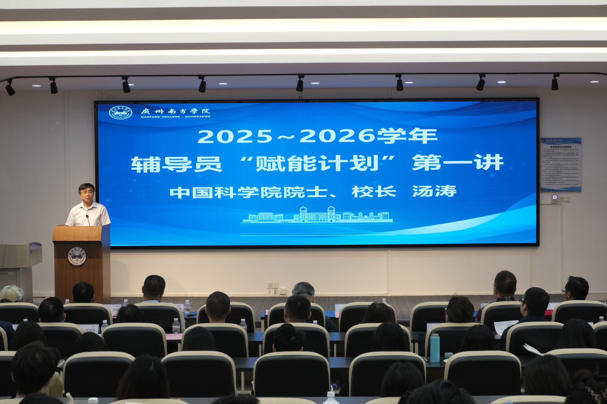 为贯彻落实《全面加强新时代高校辅导员队伍建设行动方案》精神,落实立德树人根本任务,系统总结学生工作成效,进一步加强辅导员队伍建设,10月27日下午,我校在6教粤空多功能报告厅召开2025年暑期学生工作总结会暨辅导员“赋能计划”培训会,校长汤涛院士、党委书记李建超等校领导出席会议,各学院党政负责人、分管学生工作院领导以及学生处全体成员、全体辅导员参加会议。会议由学生处朱文山处长主持。